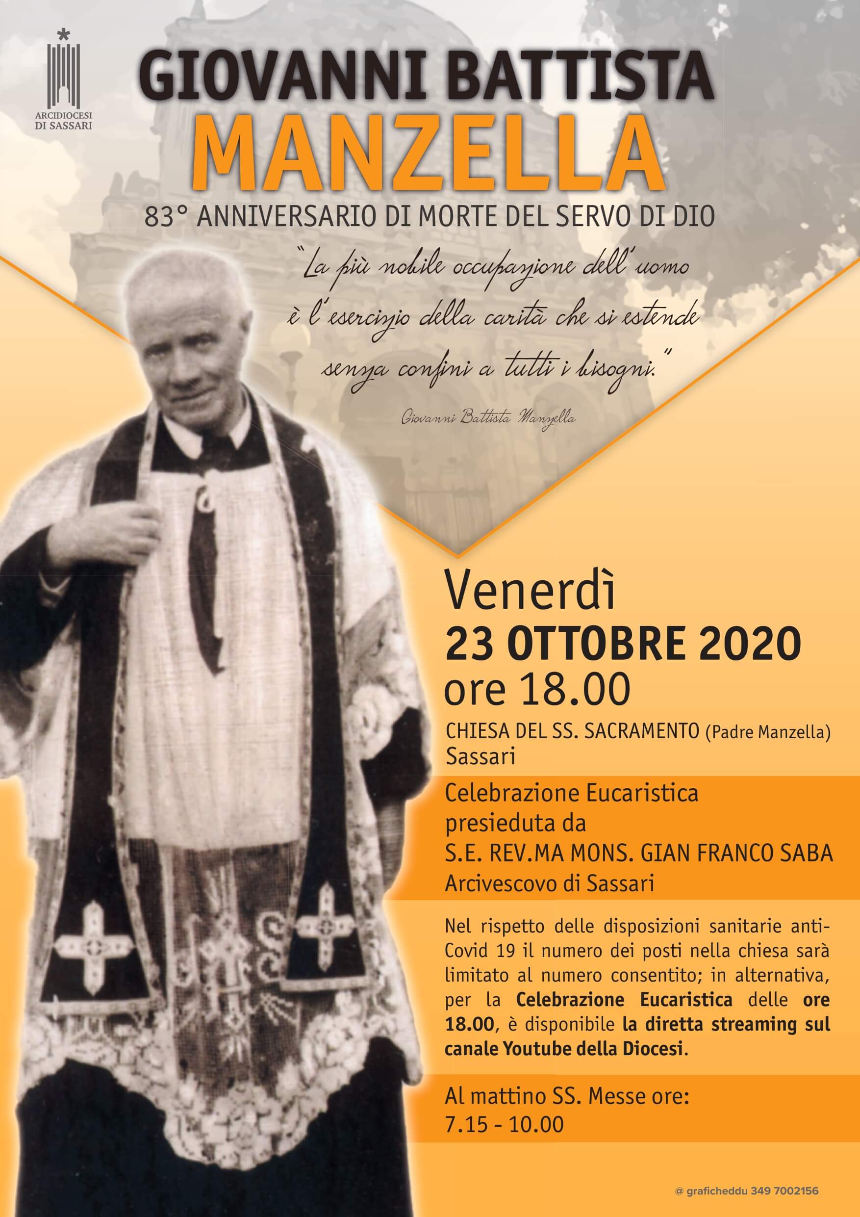 Venerdì 23 ottobre alle 18.00, presso la chiesa del Santissimo Sacramento di Sassari (Manzelliane), Mons. Gian Franco Saba presiederà la celebrazione eucaristica di commemorazione del Servo di Dio padre Giovanni Battista Manzella.