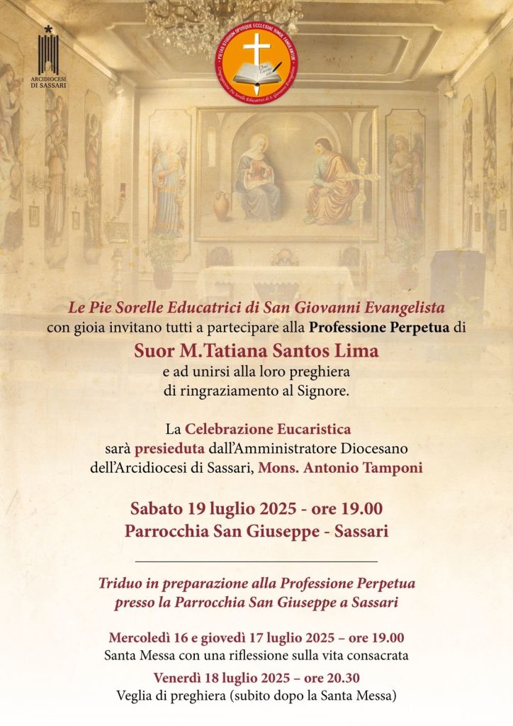 Le Pie Sorelle Educatrici di San Giovanni Evangelista con gioia invitano tutti a partecipare alla Professione Perpetua di Suor M.Tatiana Santos Lima e ad unirsi alla loro preghiera di ringraziamento al Signore.
