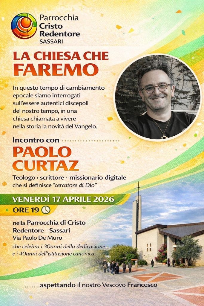 In questo tempo giubilare della comunità parrocchiale di Cristo Redentore, che festeggia i 30anni della Dedicazione della Chiesa e i 40anni dell’Istituzione canonica della Parrocchia, un nuovo appuntamento per riflettere sull’essere chiesa oggi con un ospite d’eccezione: PAOLO CURTAZ. Teologo e scrittore, divulgatore del Vangelo, conosciuto e molto seguito nel WEB come Missionario digitale (in altri ambienti verrebbe definito influencer), verrà a Sassari venerdi 17 aprile alle ore 19, nel salone parrocchiale in via Paolo Demuro, per parlare e dialogare con tutti noi su: “La chiesa che faremo”. Sarà un momento particolarmente interessante anche perché alla vigilia dell’ingresso del nuovo Vescovo Francesco nella nostra Chiesa diocesana ci permetterà di prepararci ad accogliere il nuovo Pastore che prenderà canonicamente possesso dell’Arcidiocesi turritana sabato 18 aprile.