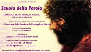 Scuola della Parola Ogni martedì di quaresima, dalle 20,30 alle 22, lettura, commento e attualizzazione del racconto della Passione dell'evangelista di Matteo guidato dal don Alessandro Pilo presieduto da Padre Paolo, Arcivescovo di Sassari nella locandina le date,...