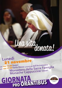 Lunedì 21 novembre Monastero della Sacra Famiglia, Sassari Monache Cappuccine ore 17 Vespri ore 17,30 SS Messa presieduta dall'Arcivescovo