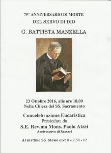 Domenica 23 ottobre alle ore 18 nella Chiesa del Santissimo Sacramento Solenne concelebrazione presieduta da S.e. Mons. Paolo Atzei, Arcivescovo di Sassari per il 79° anniversario della morte del Servo di Dio Giovanni Battista Manzella...