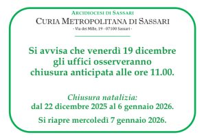 Orari degli uffici per il tempo estivo (mesi luglio – agosto) Si comunica che a partire dal 1° luglio e fino al 31 agosto 2025, la Curia sarà aperta nei giorni martedì, mercoledì e venerdì, dalle ore 10 alle ore 12.30. Sassari, 26 giugno 2025 Comunicato_Orario...