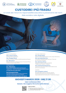La Tutela dei Minori tra Responsabilità Educativa e Prevenzione dei Rischi. Rete Sociale e Rete Digitale Giovedì 5 marzo 2026, alle ore 17.30, presso la Sala Conferenze ERSU di Sassari (Via Coppino 18 - Corte Santa Maria), si terrà l'incontro dal titolo “Custodire...