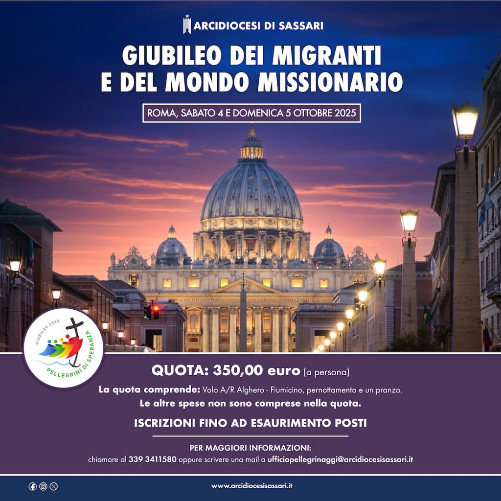 Con queste parole il Santo Padre Francesco invita anche la comunità dell’Arcidiocesi di Sassari a farsi pellegrina di Speranza. All’interno di questa sezione del sito della Chiesa turritana troverete gli aggiornamenti necessari in riferimento ai pellegrinaggi diocesani, mentre navigando sul sito ufficiale del Giubileo 2025 è possibile trovare tutte le informazioni necessarie messe a disposizione dal Dicastero per l’Evangelizzazione.